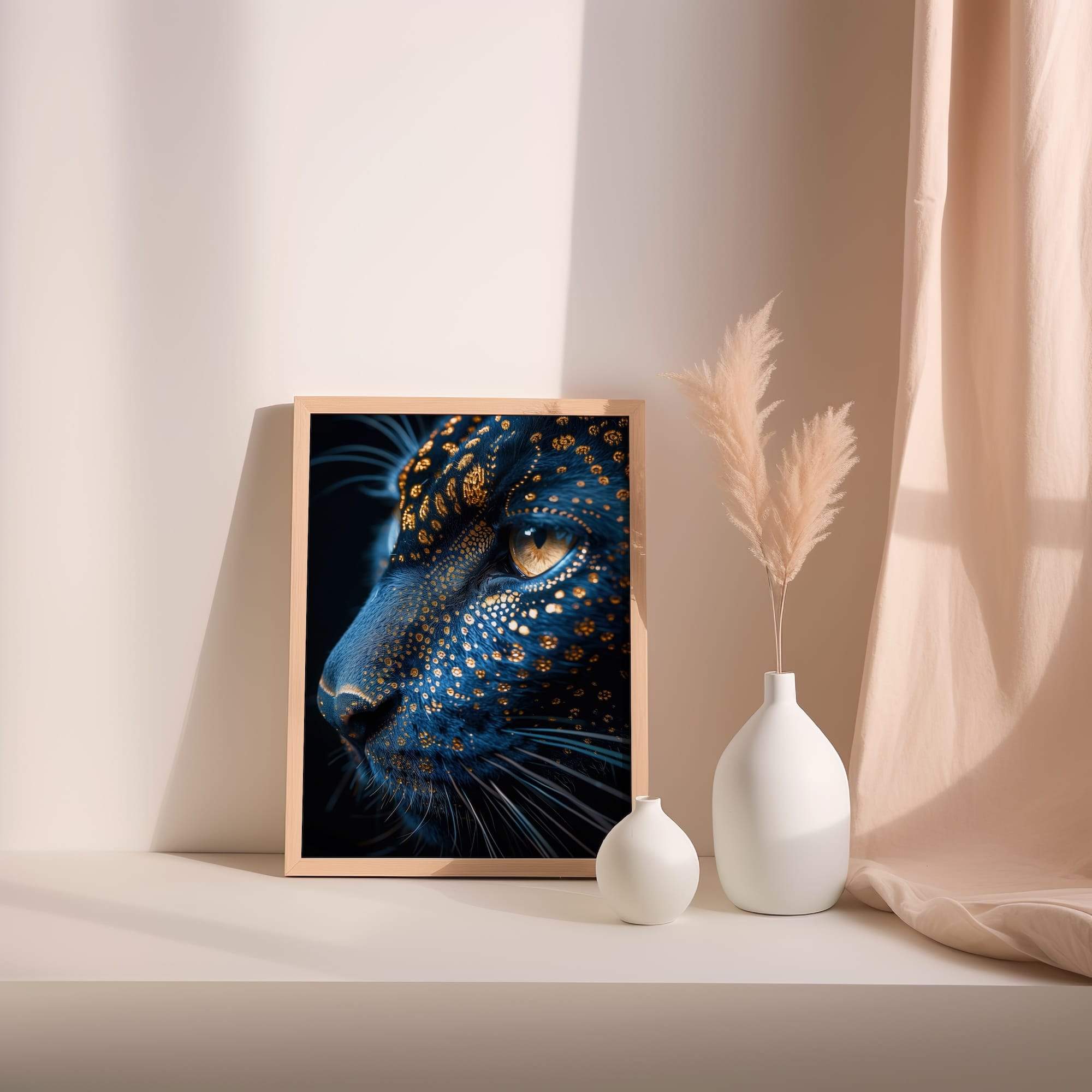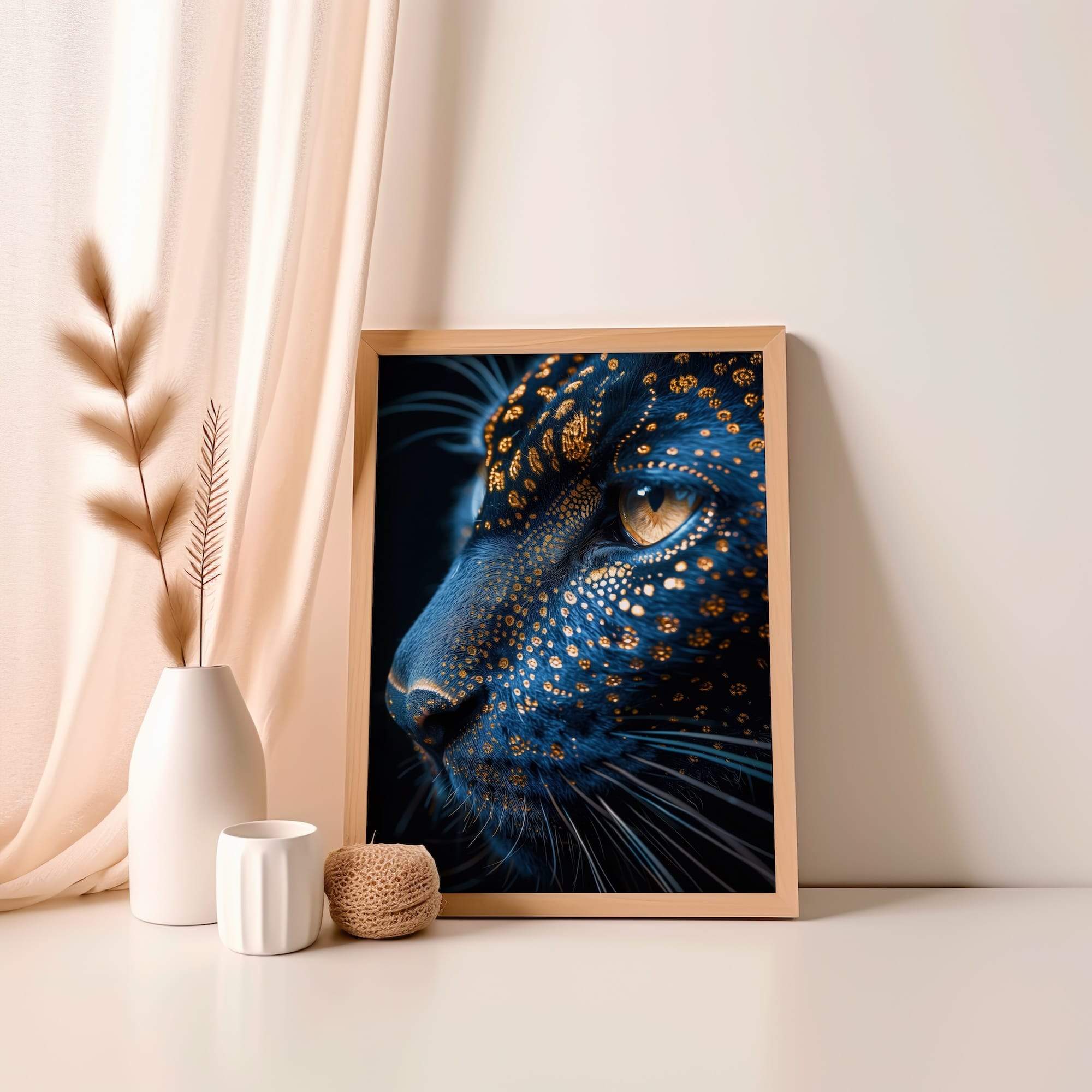 In this captivating otherworldly feline portrait, stardust delicately settles on midnight fur, creating a mesmerizing cosmic spectacle. The panther’s eye, a window to celestial wonders, emerges from a texture adorned with golden stars, where deep blue fur seamlessly merges with cosmic marvels in exquisite detail. The matte finish accentuates every celestial element while maintaining an intimate focus on this close-up study. Transcending traditional pet art, this visionary piece transforms a simple feline portrait into a magical cosmic artwork that explores the mysterious connection between earthly creatures and the vast universe above. Its mystical beauty makes it an ideal addition to a bedroom or meditation space, inspiring contemplation and wonder. The artist’s innovative approach elevates the portrait beyond mere representation, crafting a truly extraordinary piece that speaks to the infinite possibilities of the cosmos and our place within it.
