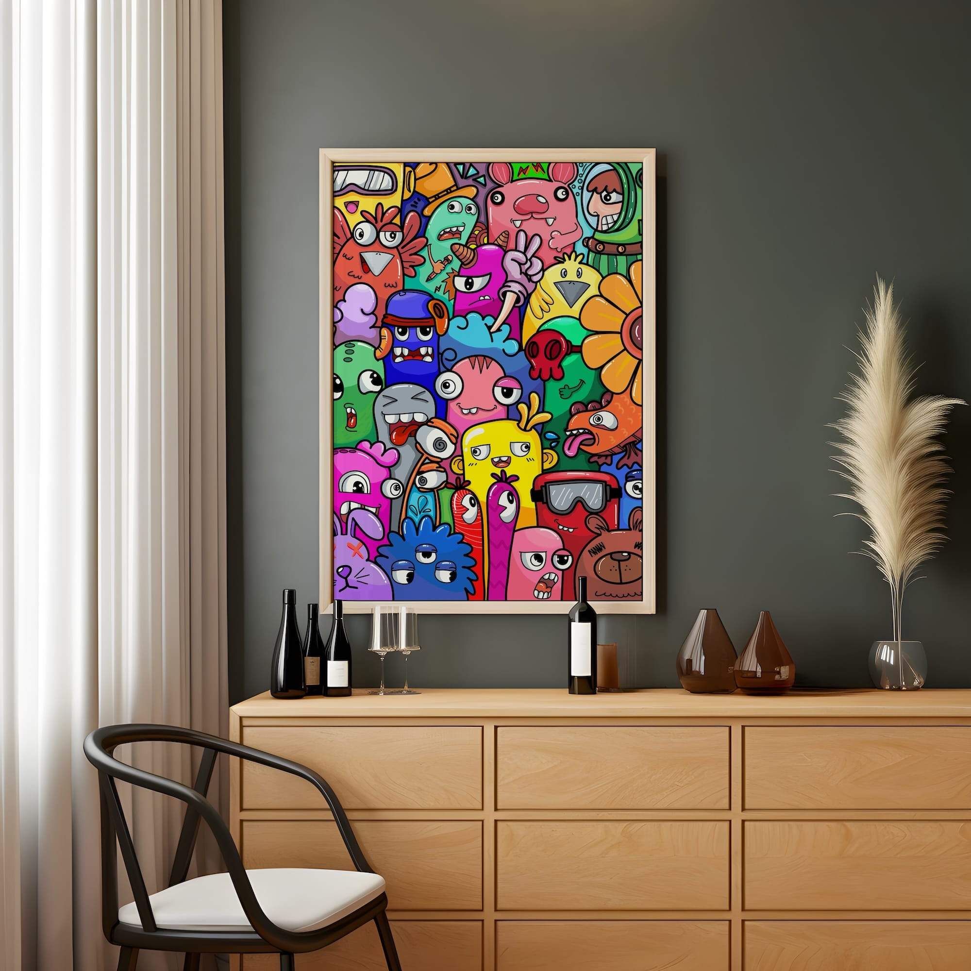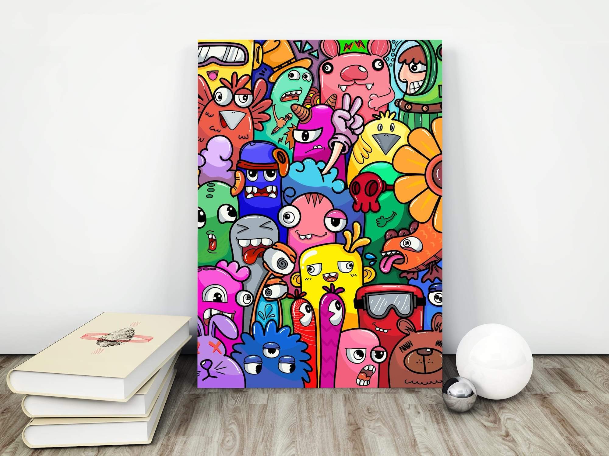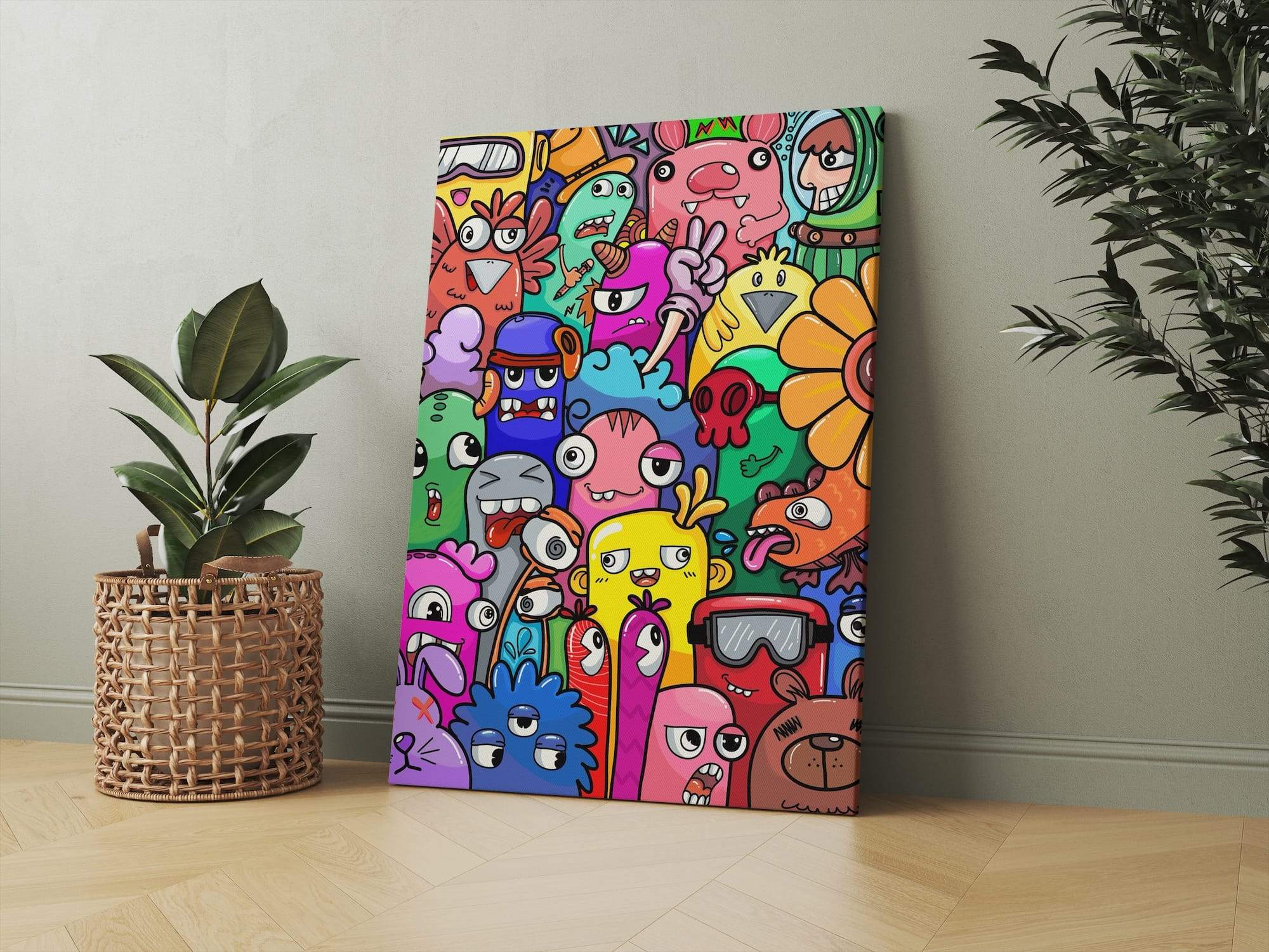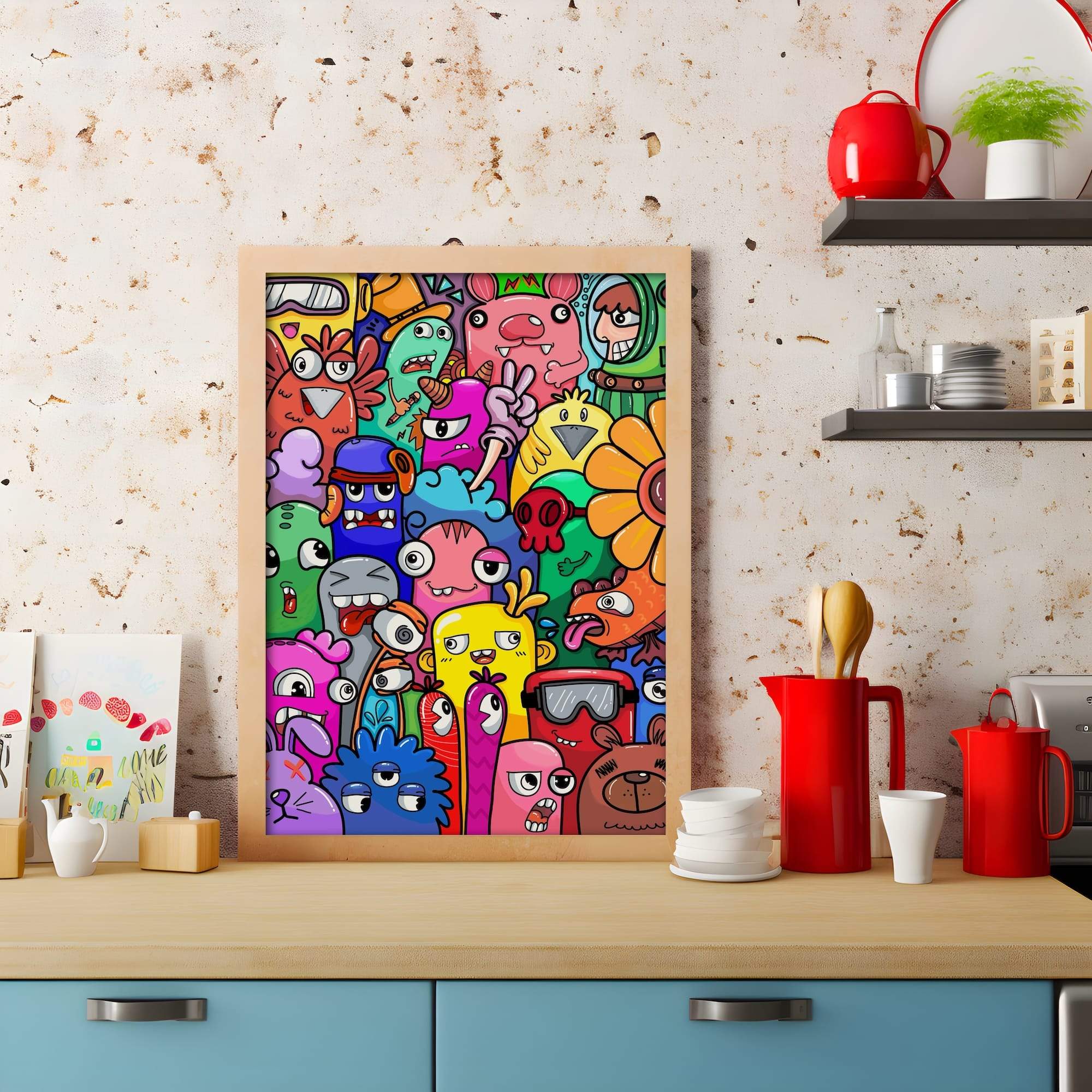 A whimsical garden party comes alive where cartoon flowers mingle with funky bunnies in delightful social chaos. This bold doodle crowd creates a visual celebration that captures the essence of springtime joy and childlike wonder. The matte finish gives these playful characters a sophisticated presence while maintaining their charming, hand-drawn appeal that makes viewers smile instinctively. Perfect for brightening a kitchen or adding character to a family room, this piece transforms ordinary walls into galleries of happiness. The funny animals and blooming flowers seem to engage in endless conversation, creating a living artwork that brings warmth and personality to any space it inhabits.