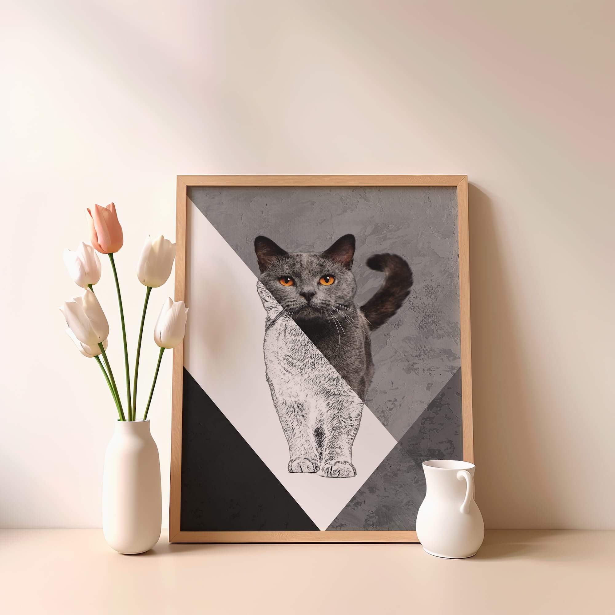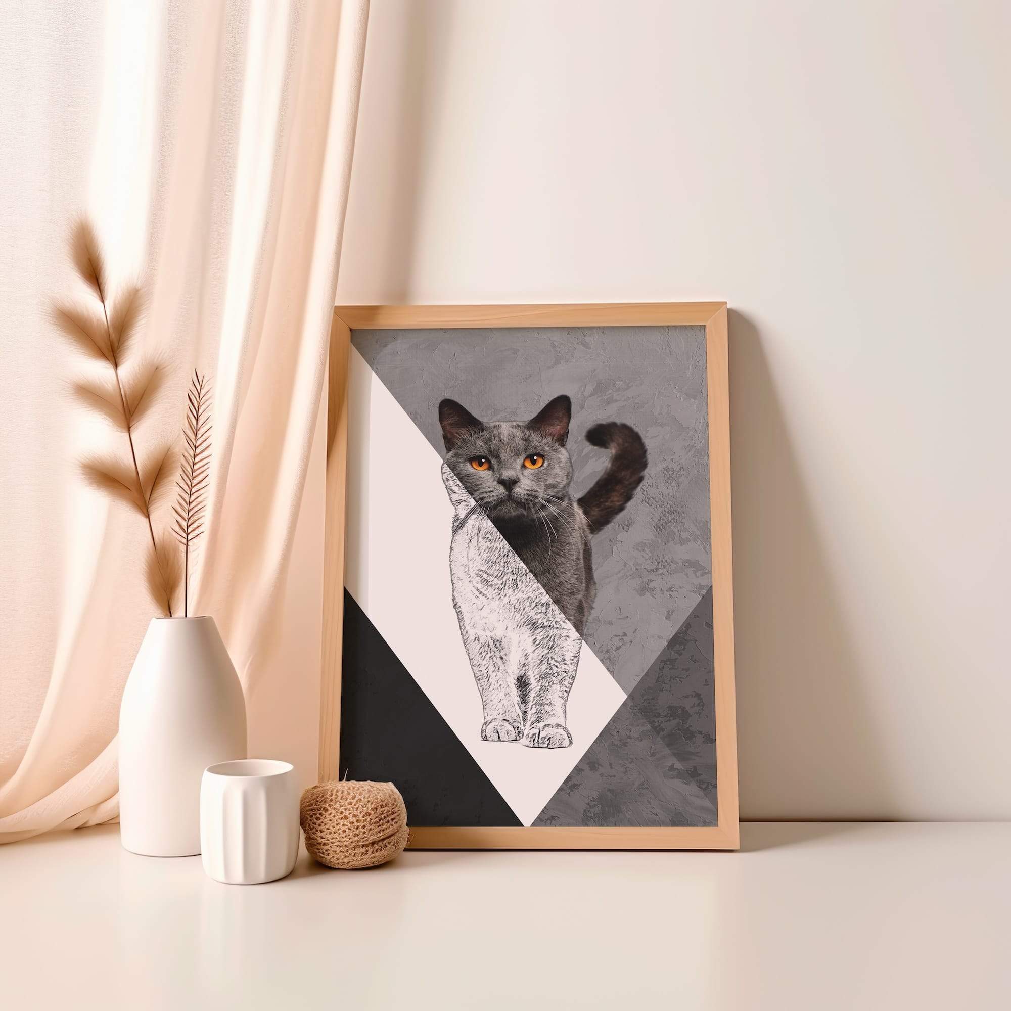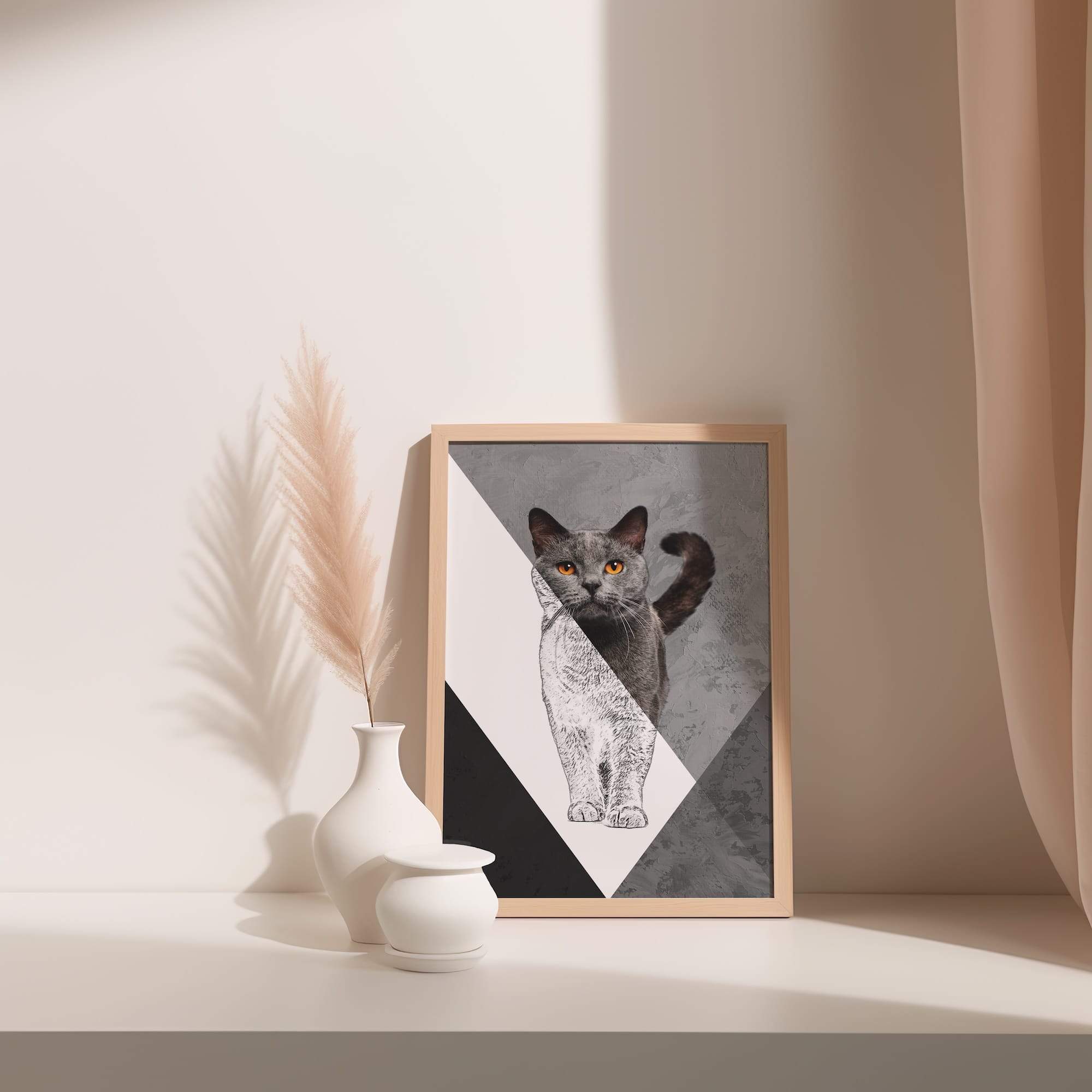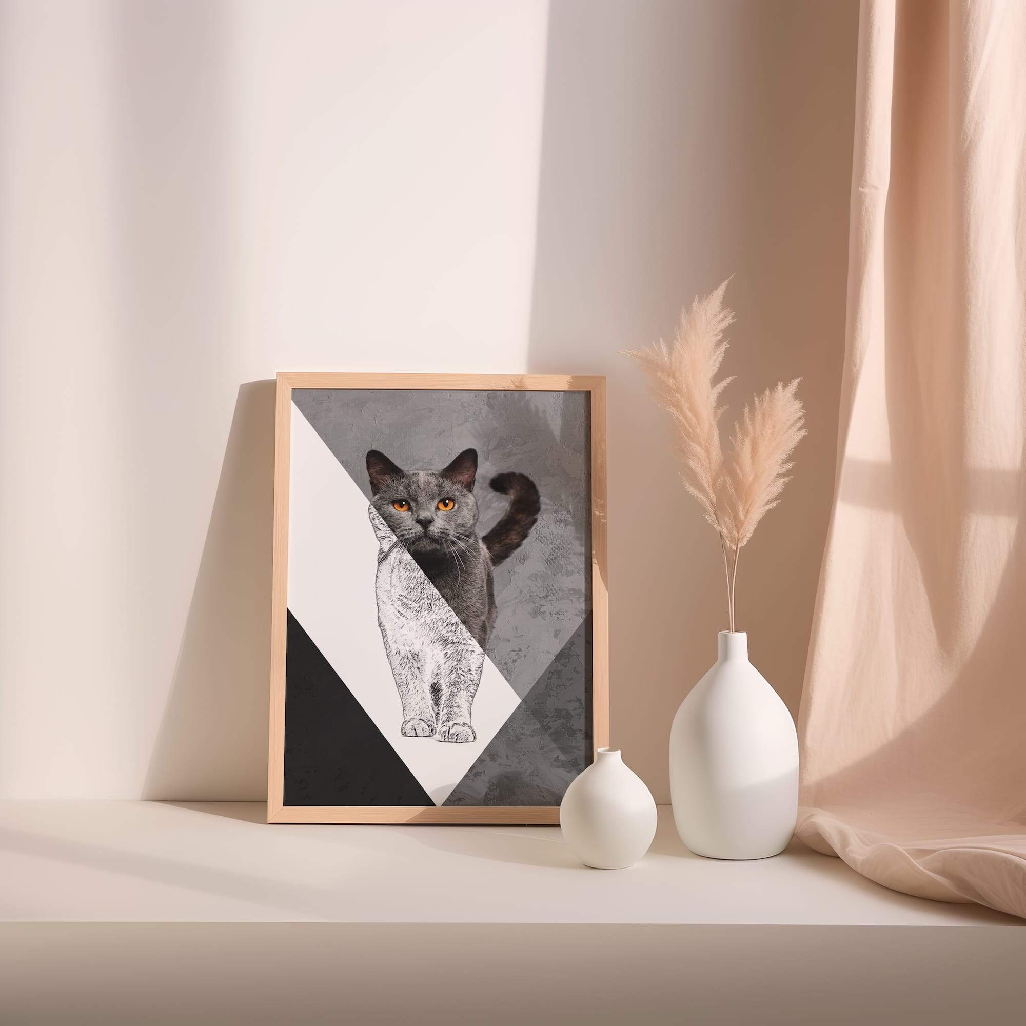 Amber eyes pierce through shadow and light in this mesmerizing dual portrait. The grey cat’s hypnotic stare emerges from a sophisticated dual-tone design that balances pet art with fine art sensibilities. The matte surface enhances the graphic contrast between sketched and realistic elements, creating visual drama that commands attention. Perfect for a bedroom or studio where its mysterious elegance can set the mood, this piece brings contemporary sophistication to cat portraiture. The artist’s masterful handling of light and shadow, combined with those piercing amber eyes, creates an artwork that’s both beautiful and slightly enigmatic. It’s feline art for those who appreciate the complex personalities of our domestic companions.
