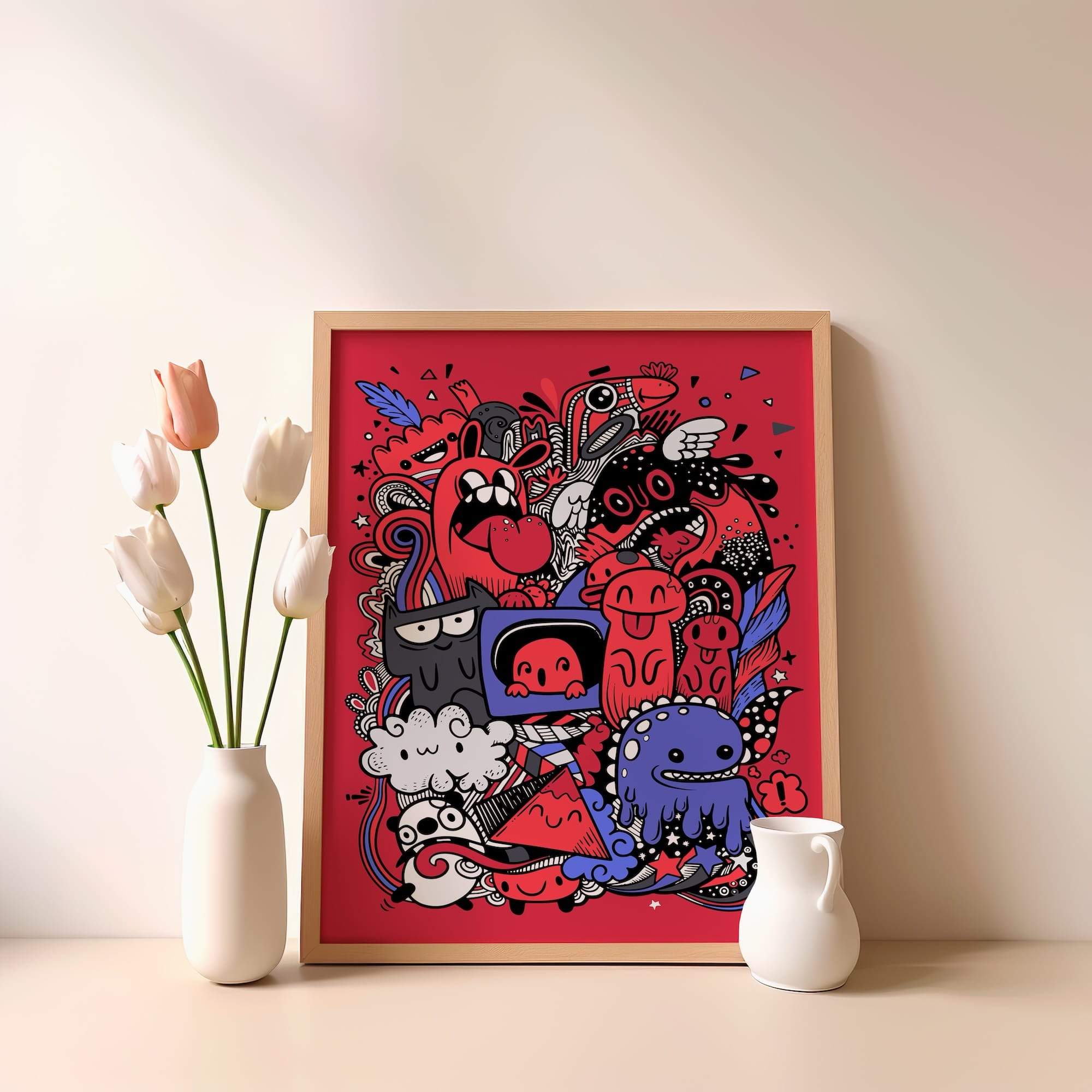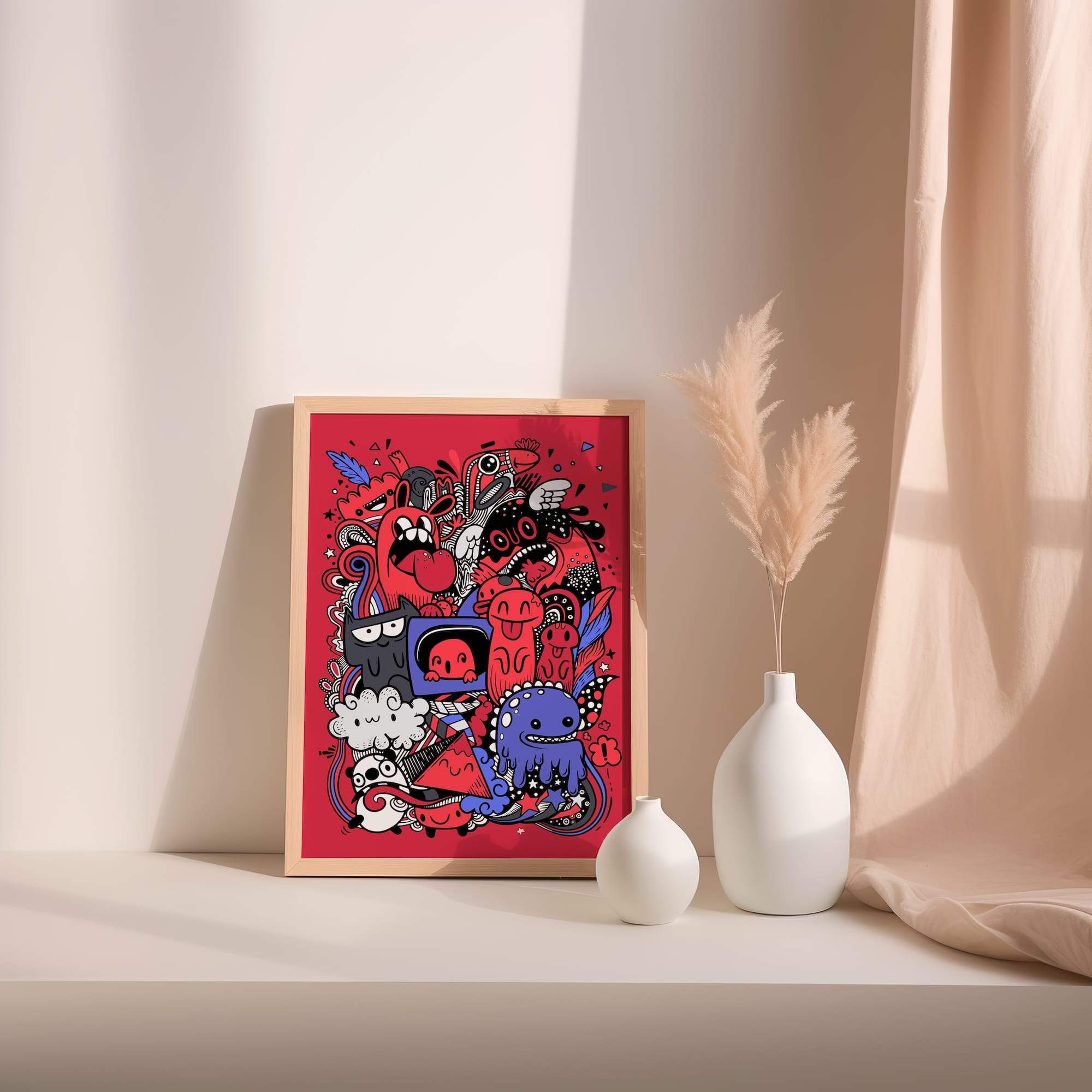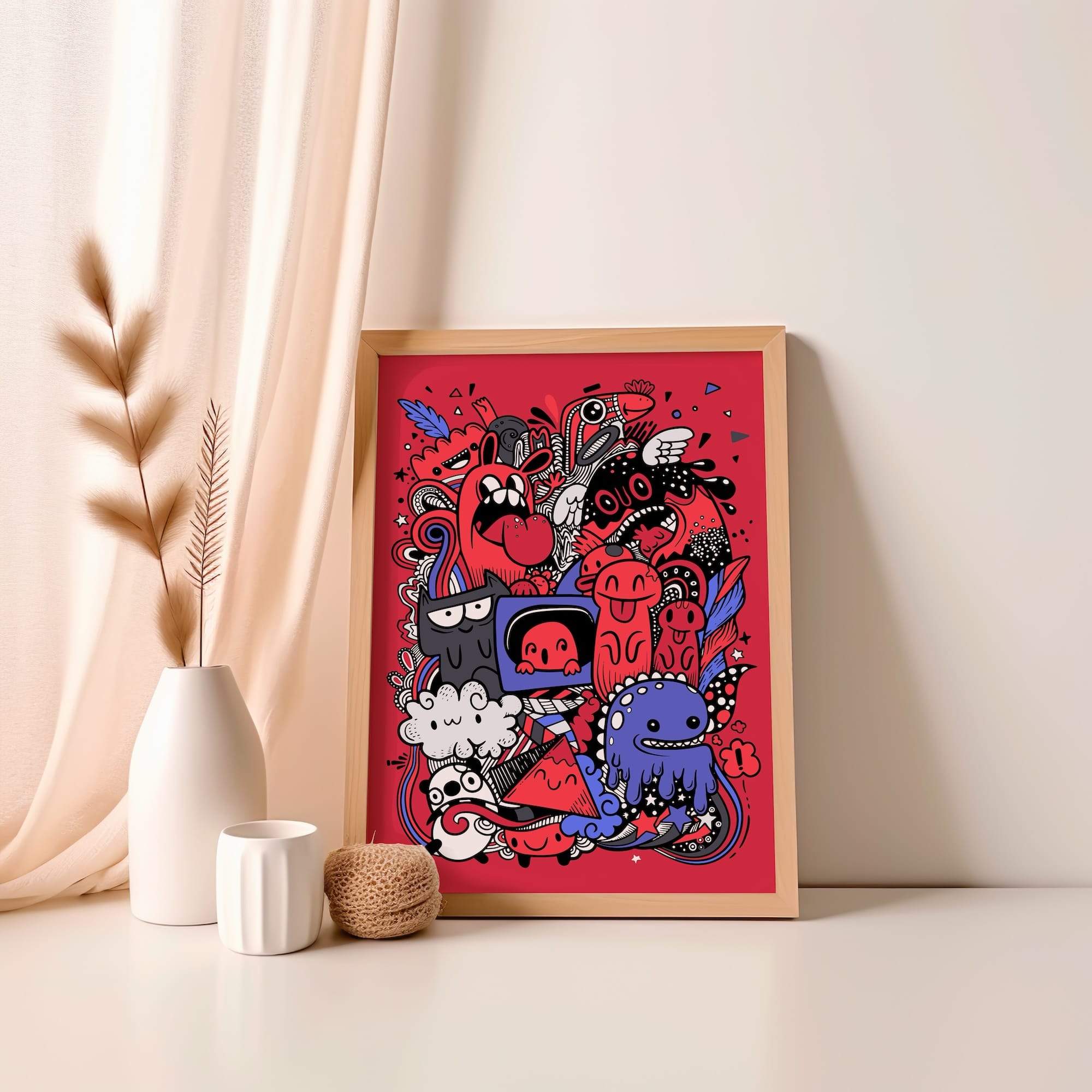 Chaos has never looked so endearingly mischievous. This red-fueled carnival of expressive monsters brings cartoon fun to its most delightfully unhinged heights, where each doodle character seems to pulse with its own chaotic energy. The matte finish amplifies the bold reds and dynamic linework, creating a graphic impact that commands attention without overwhelming. Perfect for energizing a creative studio or adding playful rebellion to a modern living space, this piece transforms any wall into a portal of joyful pandemonium. The expressive monsters seem to whisper secrets of creative freedom, making everyday spaces feel infinitely more alive with possibility.